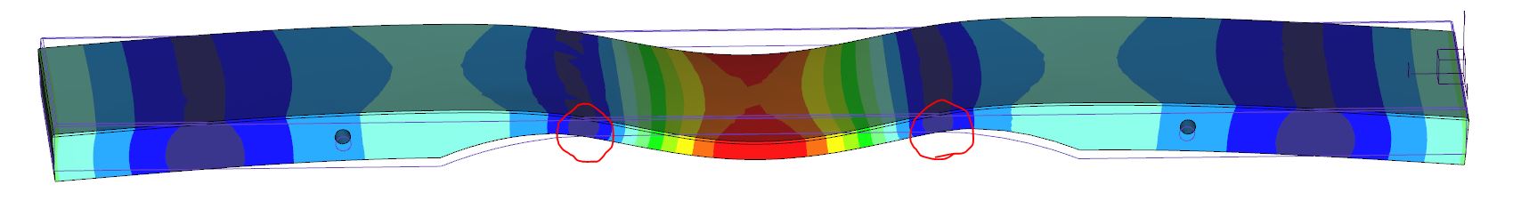 Als Ingenieure haben wir daher die Modalanalyse, eine spezielle Form der strukturdynamischen Simulation, verwendet, die mit vielen handelsüblichen CAD-Systemen möglich ist. Dabei werden von einem Bauteil mit beliebiger Geometrie die Eigenfrequenzen und Eigenschwingungsformen rechnerisch ermittelt. Die Ergebnisse könen grafisch dargestellt werden. Dadurch konnten wir jede geometrische Form (Materialabtrag) erst simulieren und die dadurch erreichten Eigenfrequenzen, also das Klangspektrum, mit unserem Ziel aus Schritt 1 vergleichen. Weiter konnten wir testen, welche geometrische Änderung welche Wirkung bezüglich der Eigenfrequenzen erreicht.