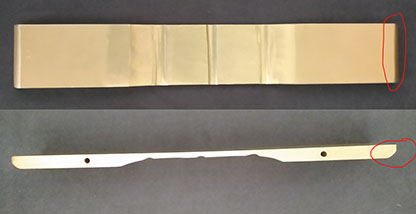 Es gibt eine Vielzahl an Möglichkeiten, eine rechteckige Klangplatte so zu bearbeiten, dass ein gewünschtes Klangspektrum erzielt wird. Bei unserer ersten Platte haben wir eine etwas unglückliche Strategie gewählt, die neben dem zentralen Ausschnitt in der Plattenmitte auch die äußeren Ränder verwendet hat. Diese Platte wurde noch von Hand mit der Feile (Strafarbeit) und dem Bandschleifer gestimmt.